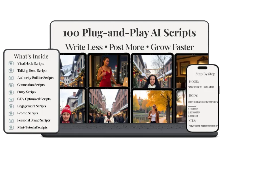The AI Script Vault gives you 100 high-converting, plug-and-play scripts designed for busy women entrepreneurs who want to show up consistently — without spending hours writing.